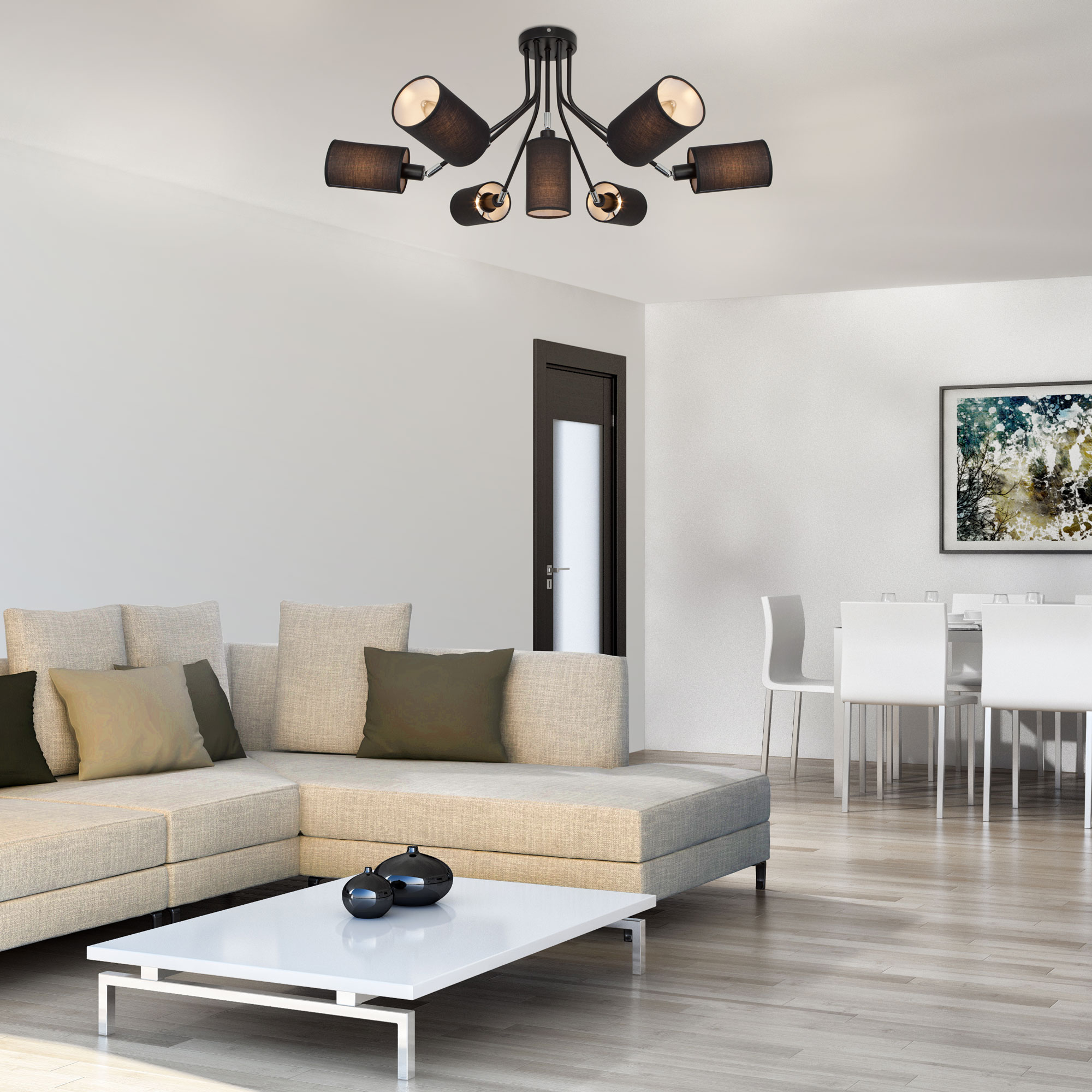 - Одна крупная люстра. Рассчитайте диаметр по базовой формуле, но разместите светильник не строго по центру, а в функциональной зоне (над диваном, столом).